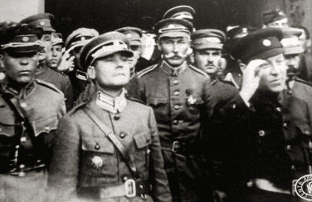 Полковник Марко Безручко в центре и Главный Атаман Симон Петлюра (справа) принимают парад украинских войск. Киев, 8 мая 1920г.